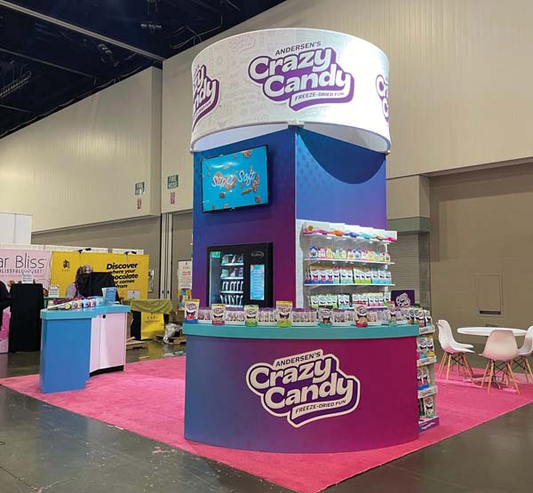 Freeze-dried confectioner Crazy Candy exhibited at Sweets & Snacks Expo with a custom 20×20 island exhibit. Its open-concept rental booth featured a striking purple to blue ombre color palette topped with a circular fabric sign as well as pink carpeting, and ample product display, including a functioning vending machine. To attract and engage attendees, Crazy […]